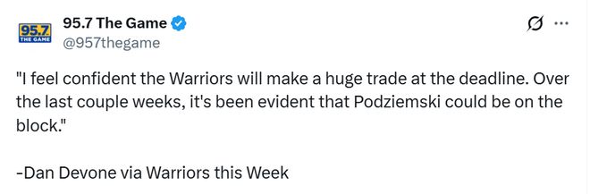 北京时间12月7日,勇士队记Dan Devone在最新节目上谈到球队潜在的交易。他说道:“我坚信勇士会在交易截止日前完成一笔重磅交易。过去几周,种种迹象已表明波杰姆斯基可能会被摆上货架。”